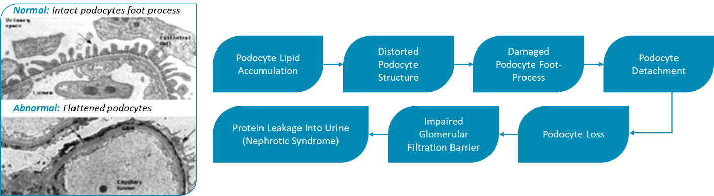 In chronic kidney diseases, cholesterol accumulates in the kidneys’ filtration system (glomerular podocytes), due in part to impaired efflux (transport out of the cell) resulting from reduced expression of the cholesterol transporters ABCA1 and ABCG13,4. The lipid accumulation causes distorted podocyte structure, damaged podocyte foot processes, and podocyte detachment and loss, which impairs kidney filtration resulting in proteinuria (leakage of protein in the urine) and disease progression2-5.